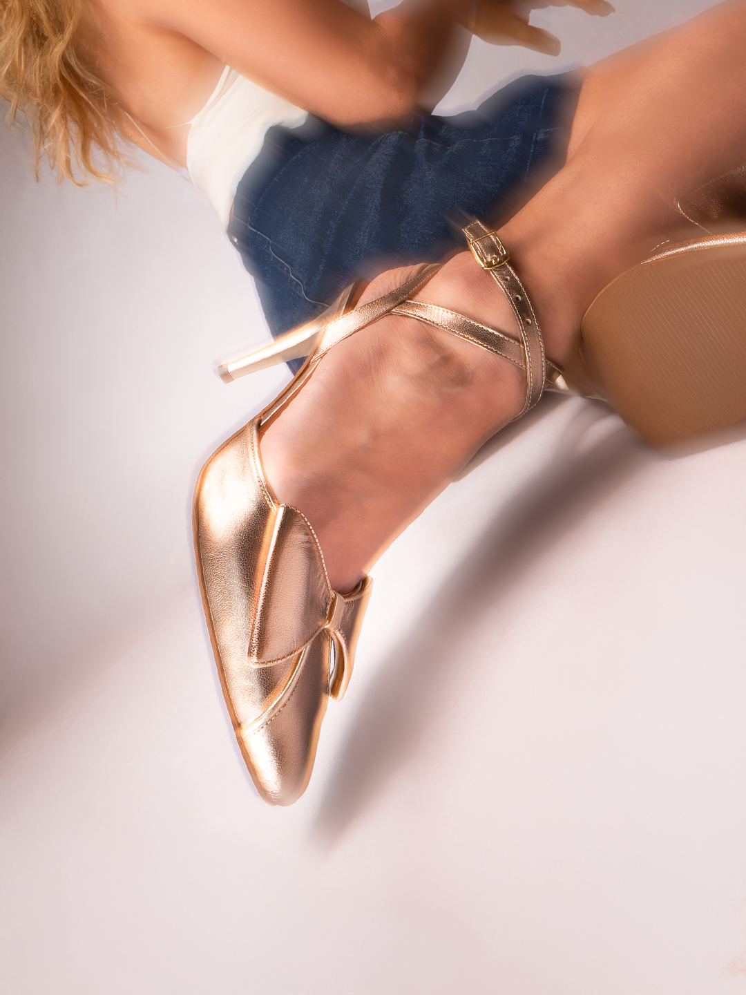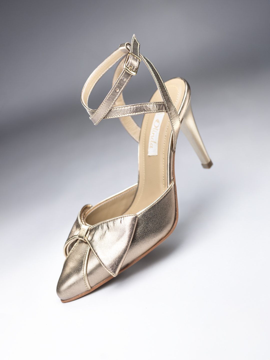 Chanel cuero peltre combinado con dorado lavado, moño en la capellada, taco 8 fino.