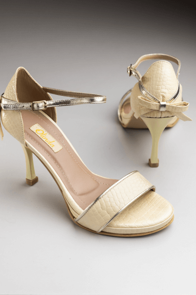SANDALIA CROCO MANTECA C/ MOÑO Y DETALLES EN DORADO LAVADO, TACO 8 FINO