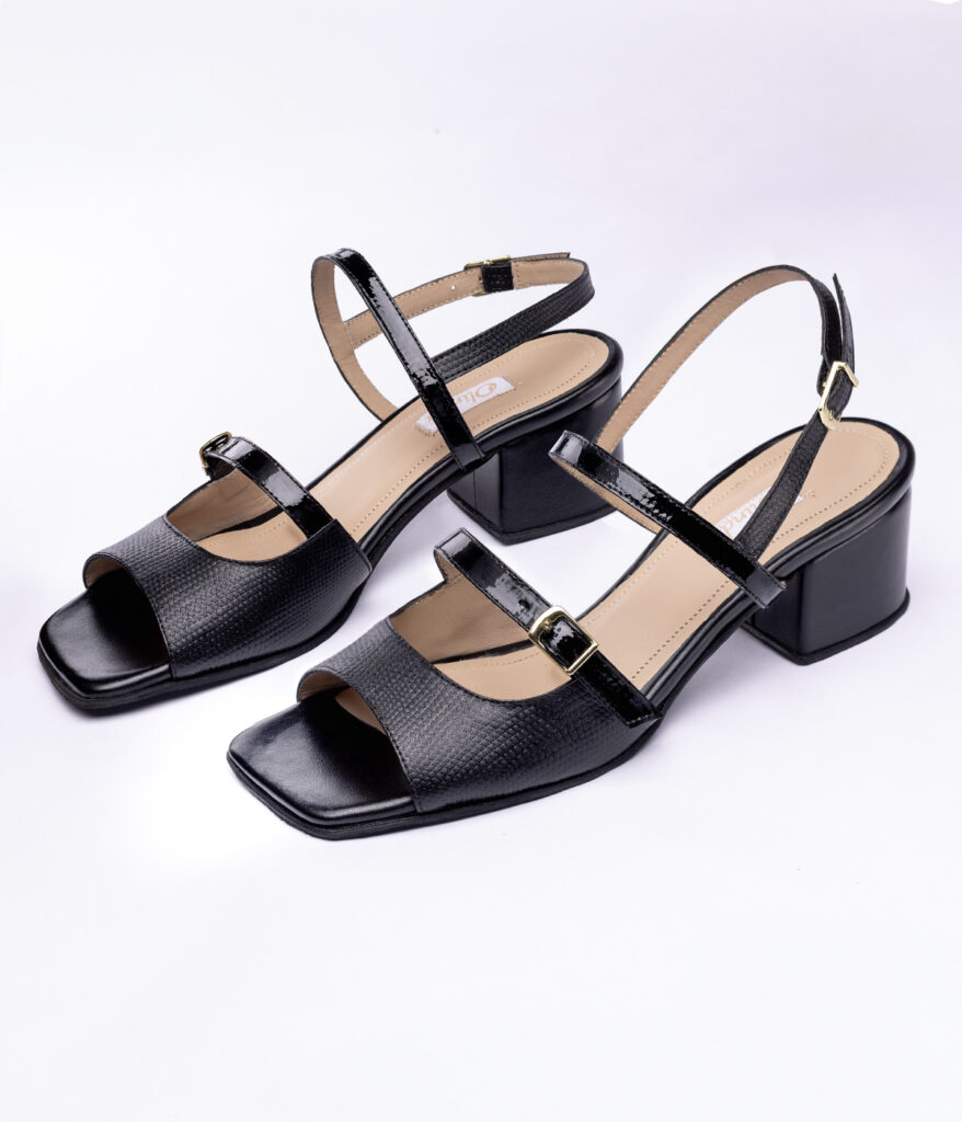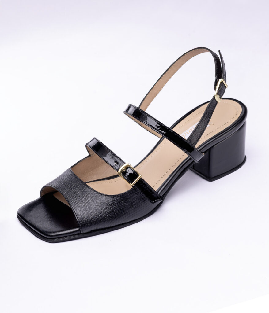 Sandalia negro con cuero nacarado, combinado con charol negro