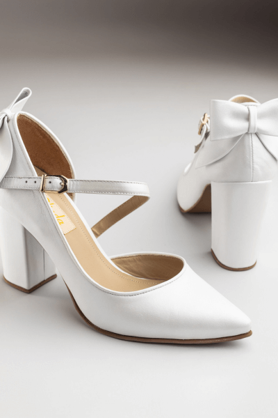 stiletto blanco nac. c/ detalles MOÑO EN EL TALON, taco 8 grueso