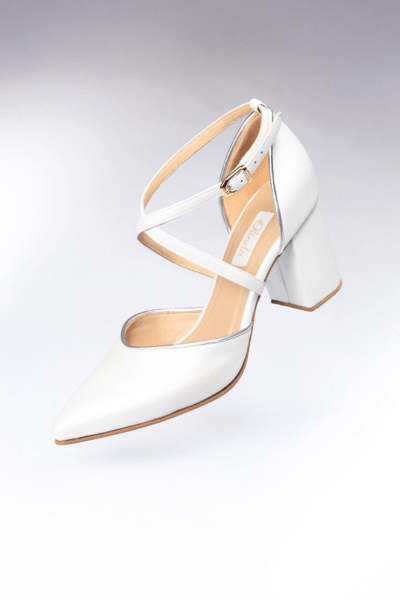 Stiletto cuero blanco con detalles de vivos en la capellada y talón en plateado, tiras cruzadas taco 6 grueso